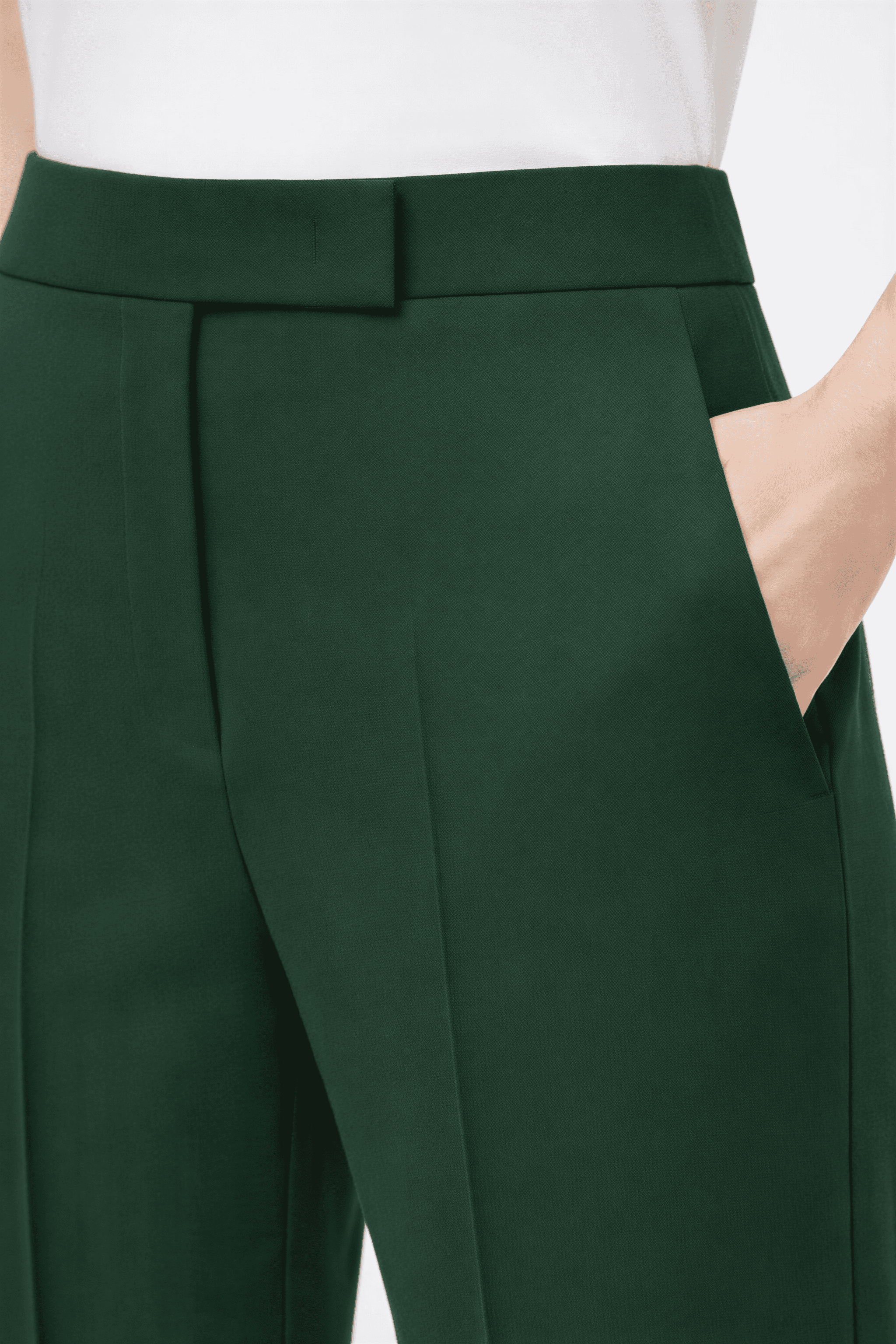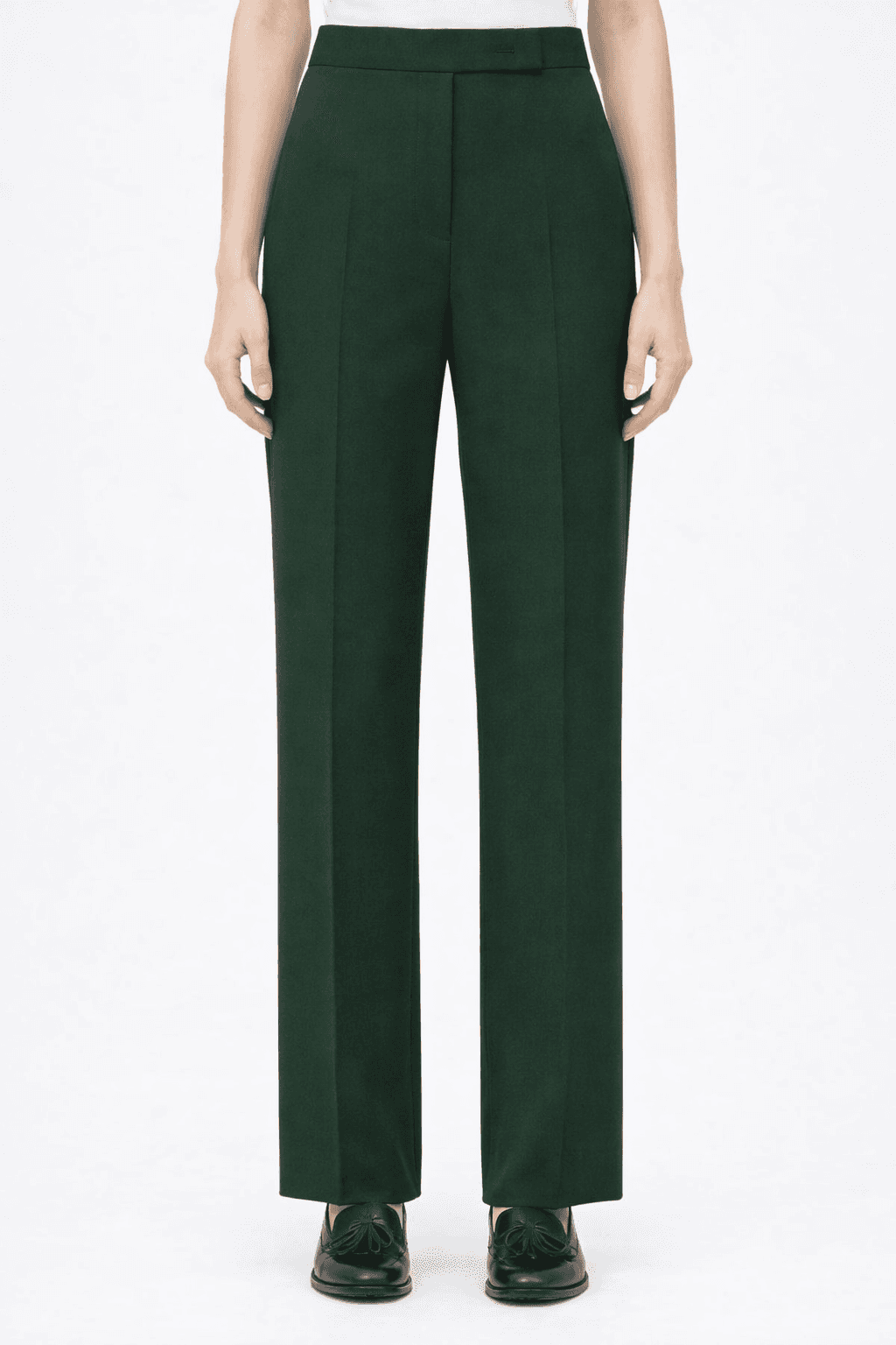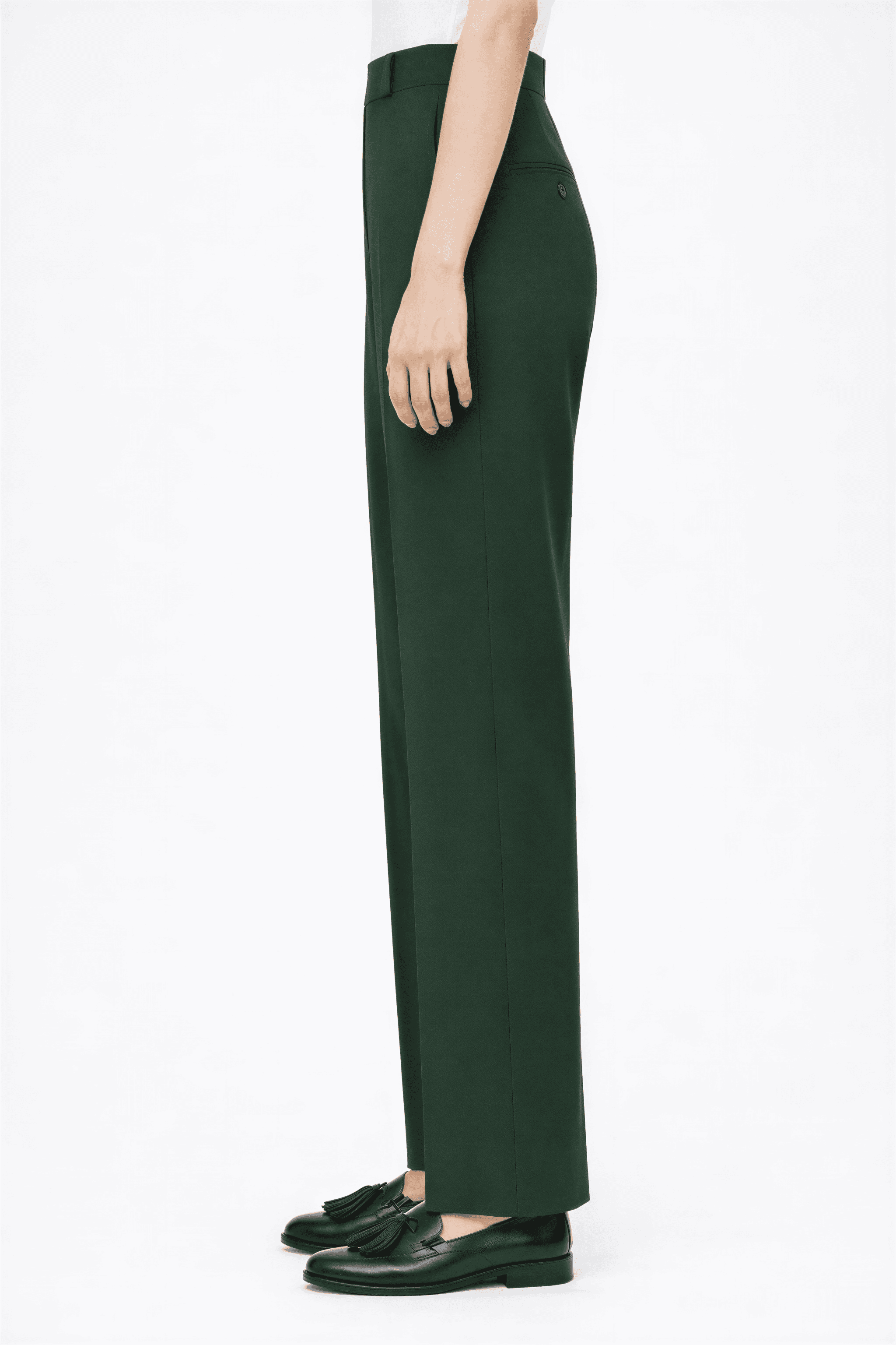 The trousers are cut to fall straight from the hip, creating a long, uninterrupted line.